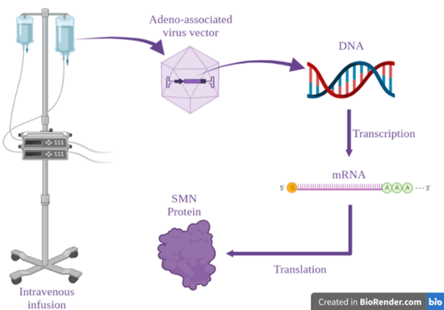 Illustration of the Spinal Muscular Atrophy 1 (SMA1) gene therapy. The adeno-associated virus contains the DNA sequence that codes for survival motor neuron (SMN) protein, which is scarce in SMA1 patients. The virus is transferred directly into the veins of SMA1 patients by intravenous infusion. The DNA sequence is introduced into the cells of the patients, transcribed to produce a messenger RNA and translated to produce the full-length SMN protein. This leads to an increase in the levels of the protein in the patients.