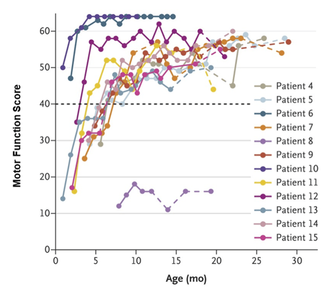 The researchers scored the motor skills and functions of the patients, such as their limb movements, on a scale from 0 to 64. To see if the gene-replacement therapy was effective, the researchers compared the motor function score of the infants with a score that was never reached by previous SMA1 patients, which is 40 (see figure below). Amazingly, 11 out of 12 patients, who received the high dose of the gene therapy, had improved motor functions over time and were able to maintain a score above 40.
