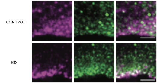 The trans-Golgi network (TGN, Green) overlaps with HTT (purple) in cortical coronal sections of control (top) and mutant human fetus (bottom). The co-localization is higher in the control than in the mutant fetuses (HD).