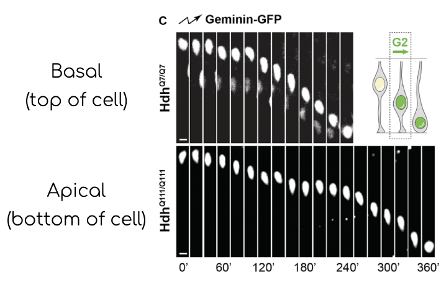 Cell differentiation is dependent on moving up and down between the basal and apical ends of the cell, a process that is known as interkinetic nuclear migration. Interkinetic nuclear migration moderates the production of neural progenitor cells and neurogenesis. Huntington’s disease disrupts the proliferation of neural progenitor cells and leads to more premature specification of cell function. In the words of Barnat et al., “HTT protein regulates cell adhesion, polarity and epithelial organization”.